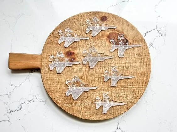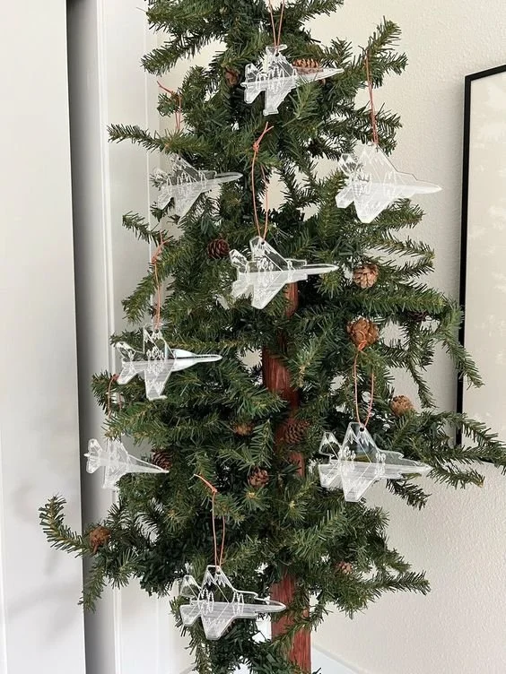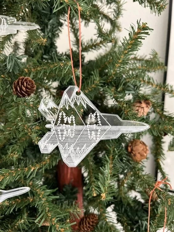 JLee Elements partnered with Lil Posh Shop to offer exclusive fighter jet holiday ornaments. The ornaments feature the fighter jet mountain scene designs and are engraved on acrylic in several jet silhouettes. Lil Posh Shop, also owned by a military spouse, offers unique military aircraft goods, baby gifts, accessories, and nursery décor with a special niche for fighter jet merchandise.